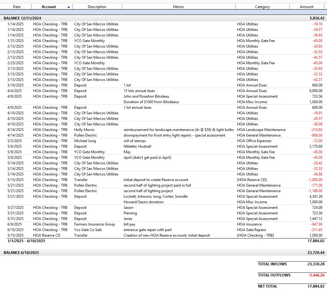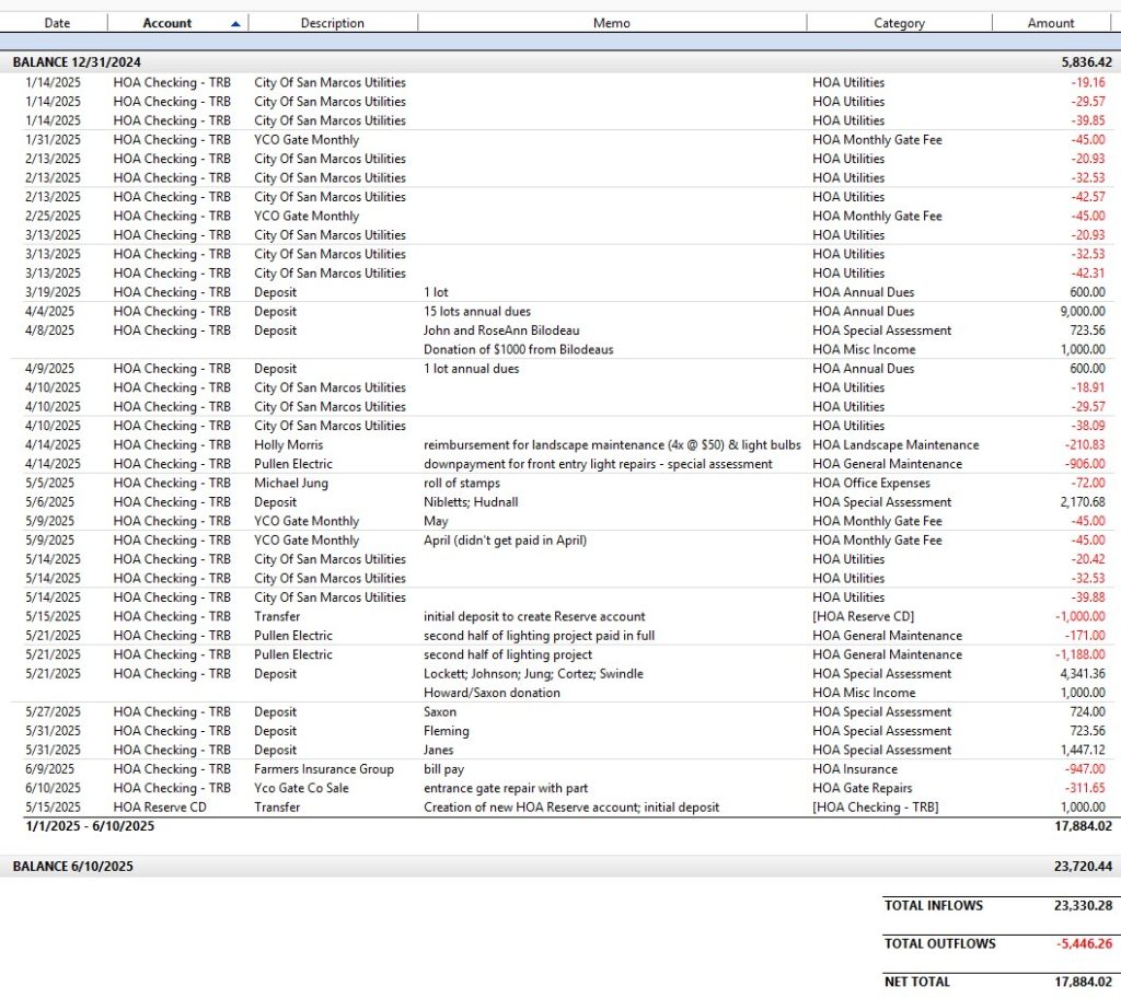 This is our YTD financial snapshot; we started the year with a balance of $5836.42. Annual dues and Special Assessments added a total of $21, 176.96 to the account (one Special Assessment deposit outstanding); an additional $2000 was added from donated funds along with $50 in title company fees collected.